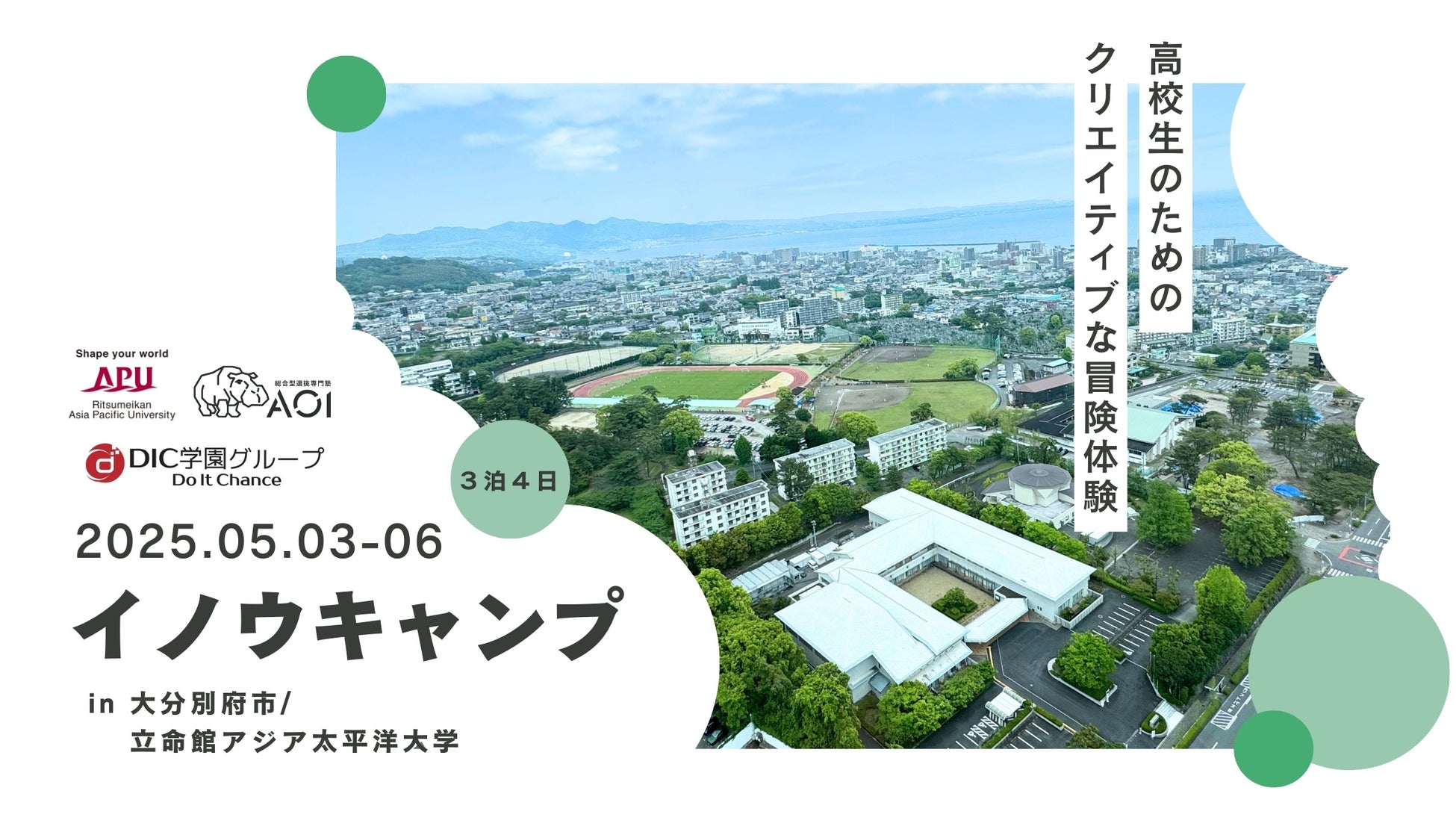 「総合型選抜専門塾AOI」(以下AOI)を運営する株式会社花形(京都府京都市、代表取締役:小澤 忠、以下当社)株式会社花形は、立命館アジア太平洋大学(大分県別府市、学長:米山裕、以下APU)、株式会社ディック学園(大分県大分市、代表取締役社長:赤嶺 一夫、以下DIC)と共同で、高校生が大分県別府市に滞在しながらフィールドワークなどのグループアクティビティを通して新しいまちづくりを提案する「イノウキャンプ」を実施いたします。最終日にはグループでの作成物についてAPUの教員に向けてプレゼンテーションを行い、講評を受けます。