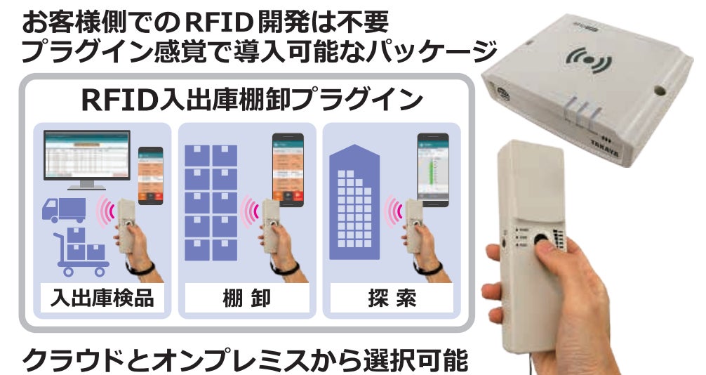 据置型RFIDリーダライタとパッケージソフト「入出庫プラグイン」を組み合わせることで、ゲートを通過するだけの入出庫一括検品を実現します。オプションの「シンプル在庫機能」を使用すれば在庫数の把握も可能です。CSVやAPIで上位システムと連携しますので、既存基幹システム等にプラグイン感覚でRFIDを導入できます。