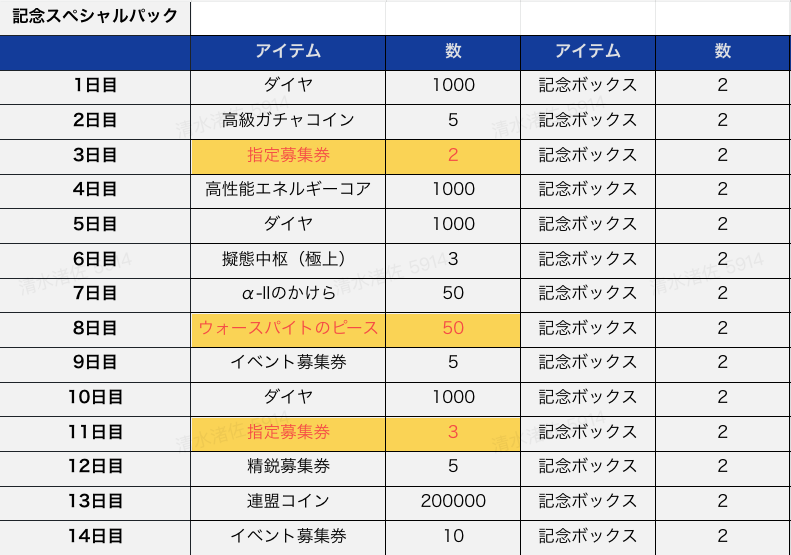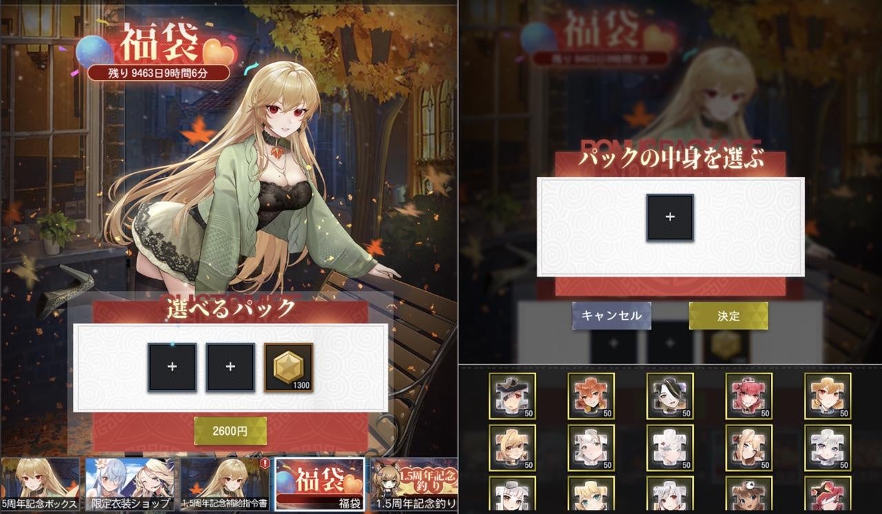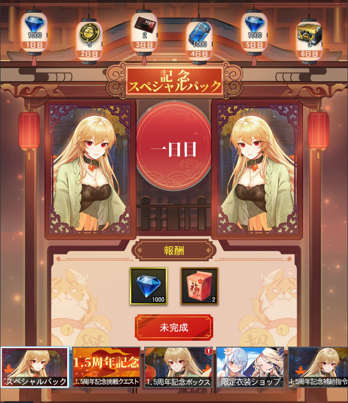 1.5周年を記念し、指揮官様には毎日無料で以下のパックをプレゼントいたします。さらに、日替わりで超お得パックが購入できます。