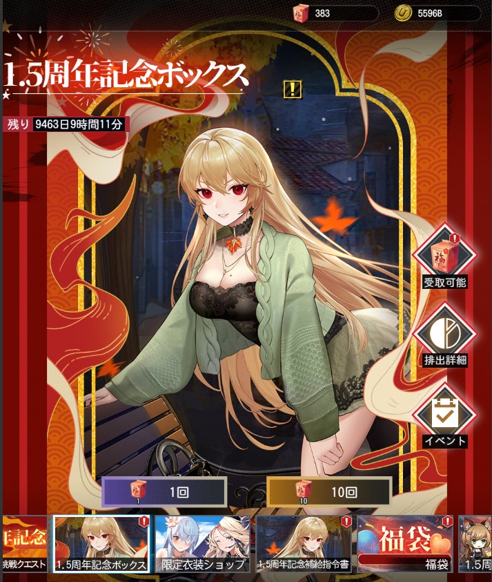 無料パックの中身はこちらです!特に3日目(本日です!)と11日目にもらえる「指定募集券」は新機能である「指定募集」ガチャに使うことができ、以前から狙っている強力な限定戦姫を手に入れるチャンスです!また毎日もらえる1.5周年記念アイテム「記念ボックス」の中身は抽選で、豪華賞品ばかりが当たります。ぜひ毎日ログインして、豪華アイテムをゲットしましょう!
