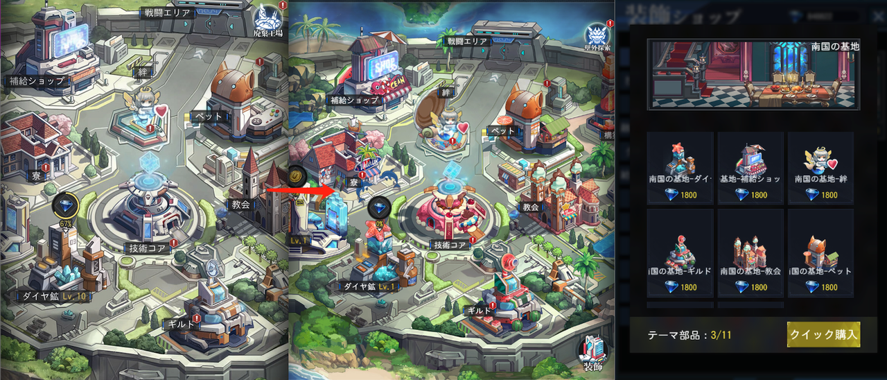 装飾ショップで基地の装飾を購入して、基地の建物を南国風にデコレーションすることができます!
