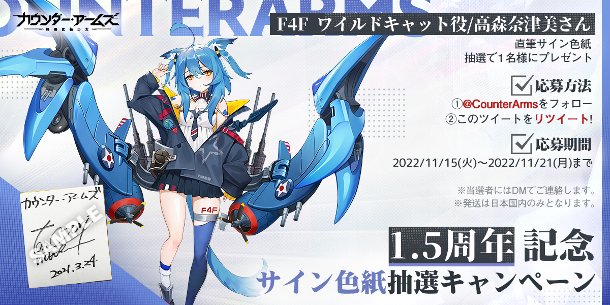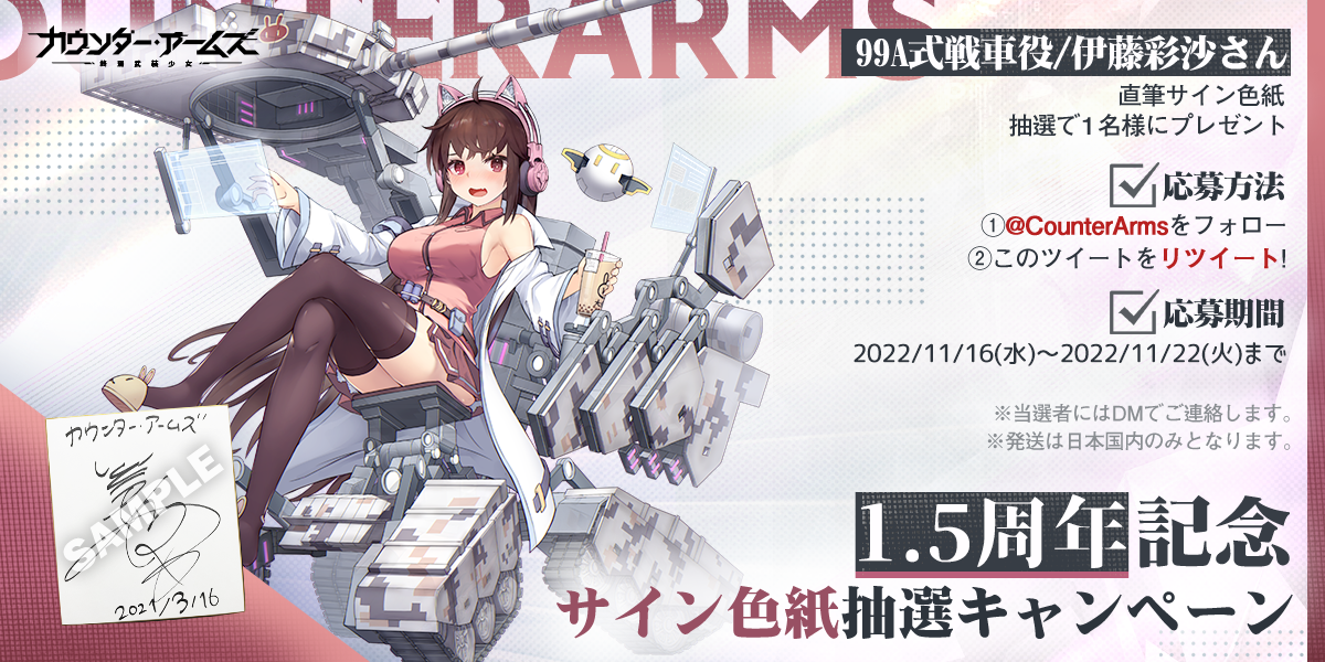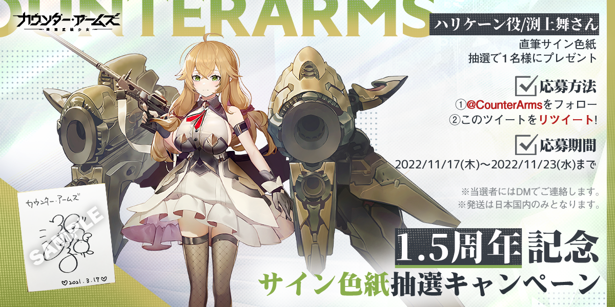 カウンターアームズに出演している、人気声優の色紙が当たる!14日間日替わりのプレゼントキャンペーンをTwitterにて毎週実施中です!