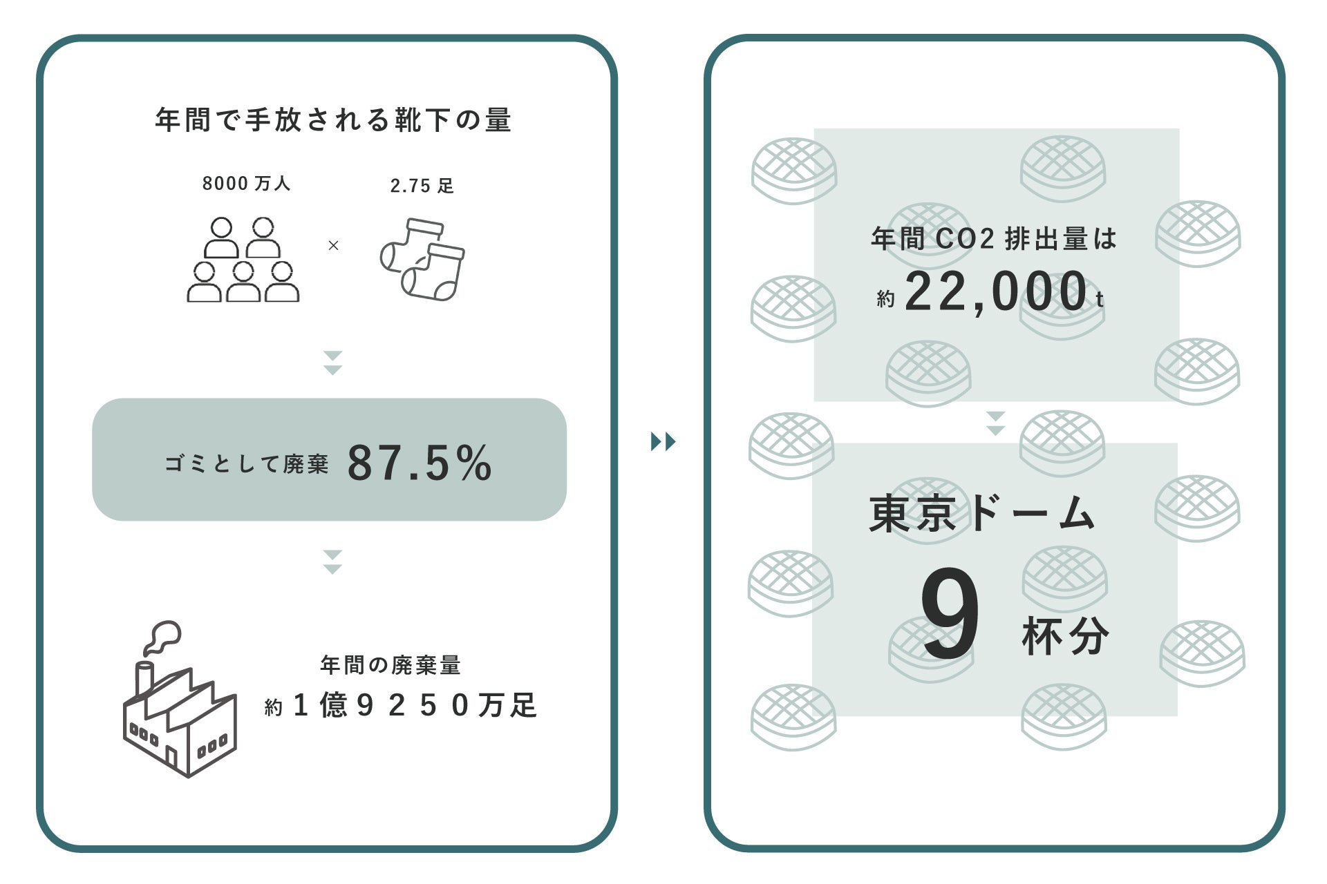 仮に日本の人口の15-70歳までの8000万人が、本調査の結果明らかになったように、年間で一人あたり平均2.75足の靴下を手放して、そのうち87.5%をゴミとして廃棄していると仮定すると、年間の廃棄量は合計1億9250万枚におよび、衣類の廃棄に伴うCO2排出量が1kgあたり2.29kg-CO2、靴下1足の重さを約100gと仮定すると、年間で約22,000トンものCO2排出量に加担していることがわかります。*3