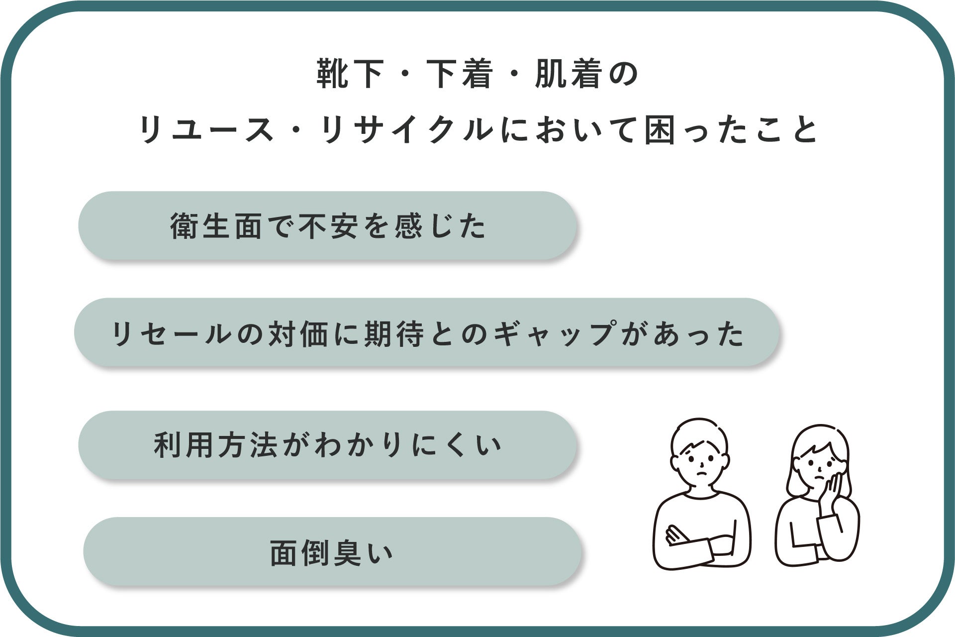 靴下・下着・肌着をリユース・リサイクルする際に、「どのようなことで困ったか」という問いに対する回答として、あまりに汚れすぎていて不安/臭い/使用感が気になる/リサイクルショップでは買い取ってもらえないなど、「衛生面で不安を感じたこと」や、思うように売れなかった/高くならないなど、「リセールの対価に期待とのギャップがあった」ことが挙げられました。