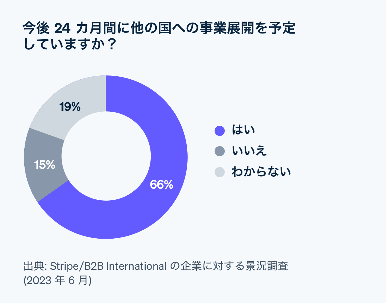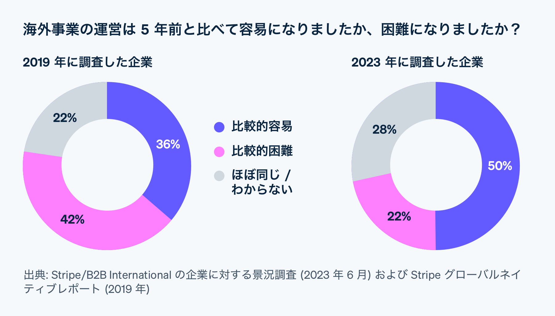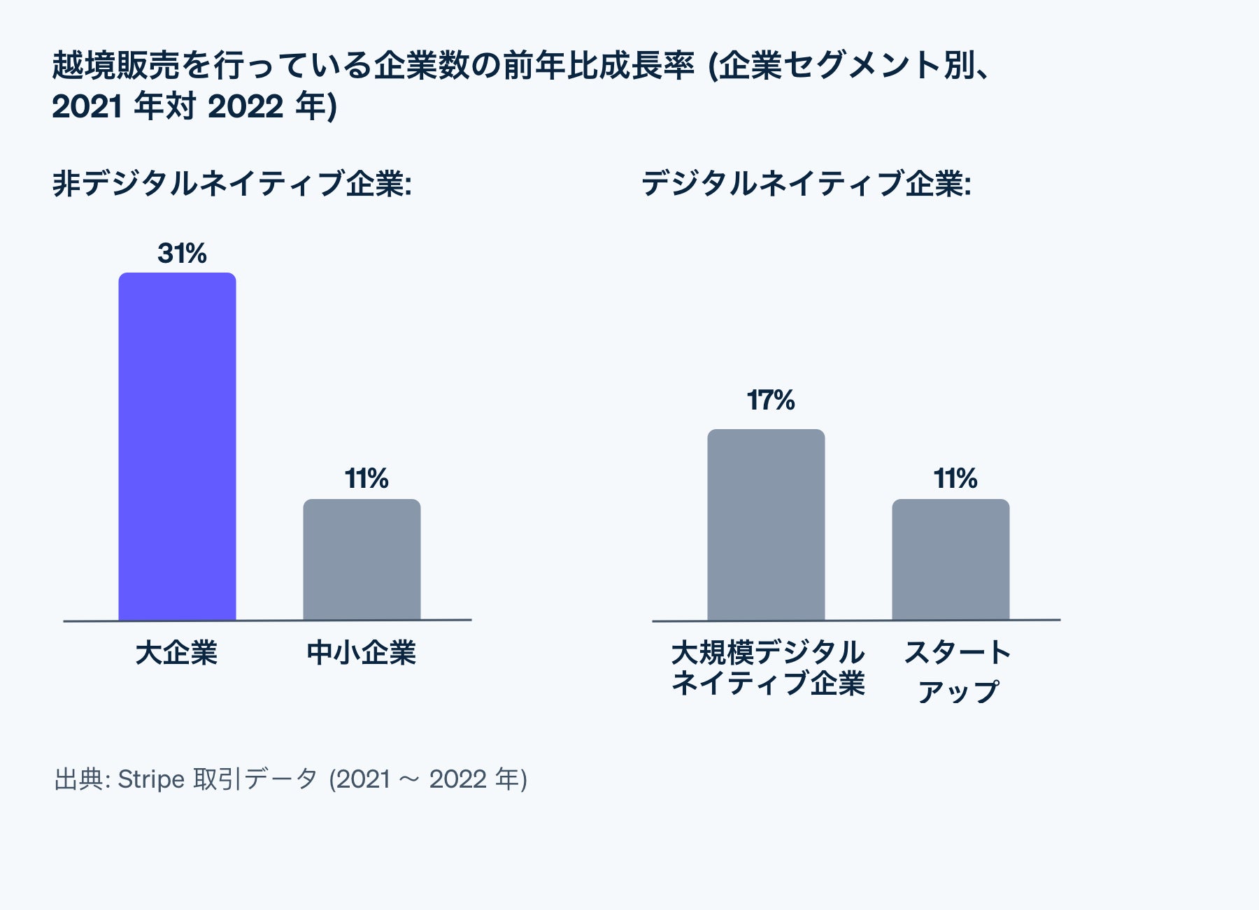 同時に、伝統的な大企業も国境を越えた事業展開に傾注しています。2021 年から 2022 年にかけて、Stripe で「国際的に販売する企業」は 31% 増加しており、特に日本企業は 8 ポイント高く、39% 増加していることが分かりました。調査対象となった大企業の 50% が「今後 2 年間でさらなる国際展開を計画している」と回答しています。