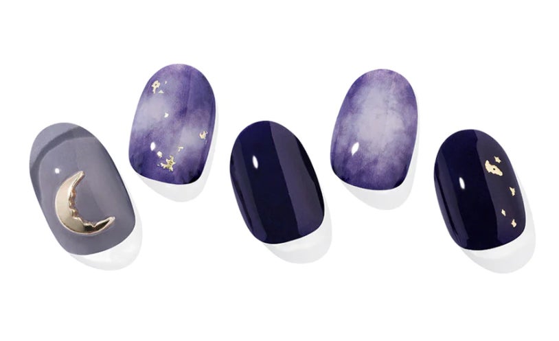 ロマンチックな気分を演出する月食ネイル。月が地球の影に入り欠けていく、月食の空をモチーフにしたデザイン。金色の月のパーツを置いたポイントネイルが、指先に強い存在感を与えます。