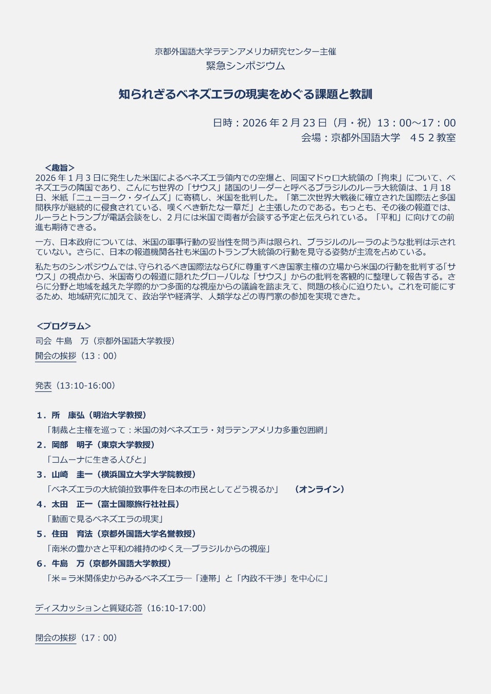 京都外国語大学(京都市右京区、学長:小野隆啓)は、2026年2月23日(月・祝)、緊急シンポジウム「知られざるベネズエラの現実をめぐる課題と教訓」を開催いたします。