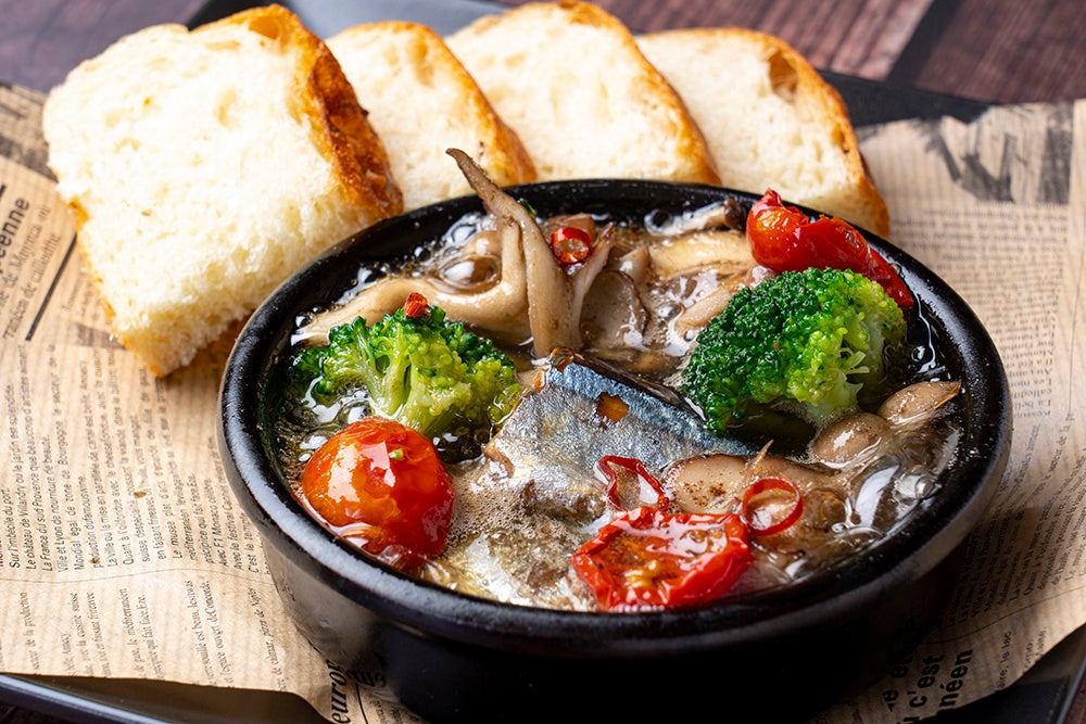 ワインやスパークリングと秋の夜長を楽しみたい北海道産秋刀魚が丸ごと一本楽しめる贅沢アヒージョが完成しました。フォカッチャをオイルに浸して楽しんでも◎