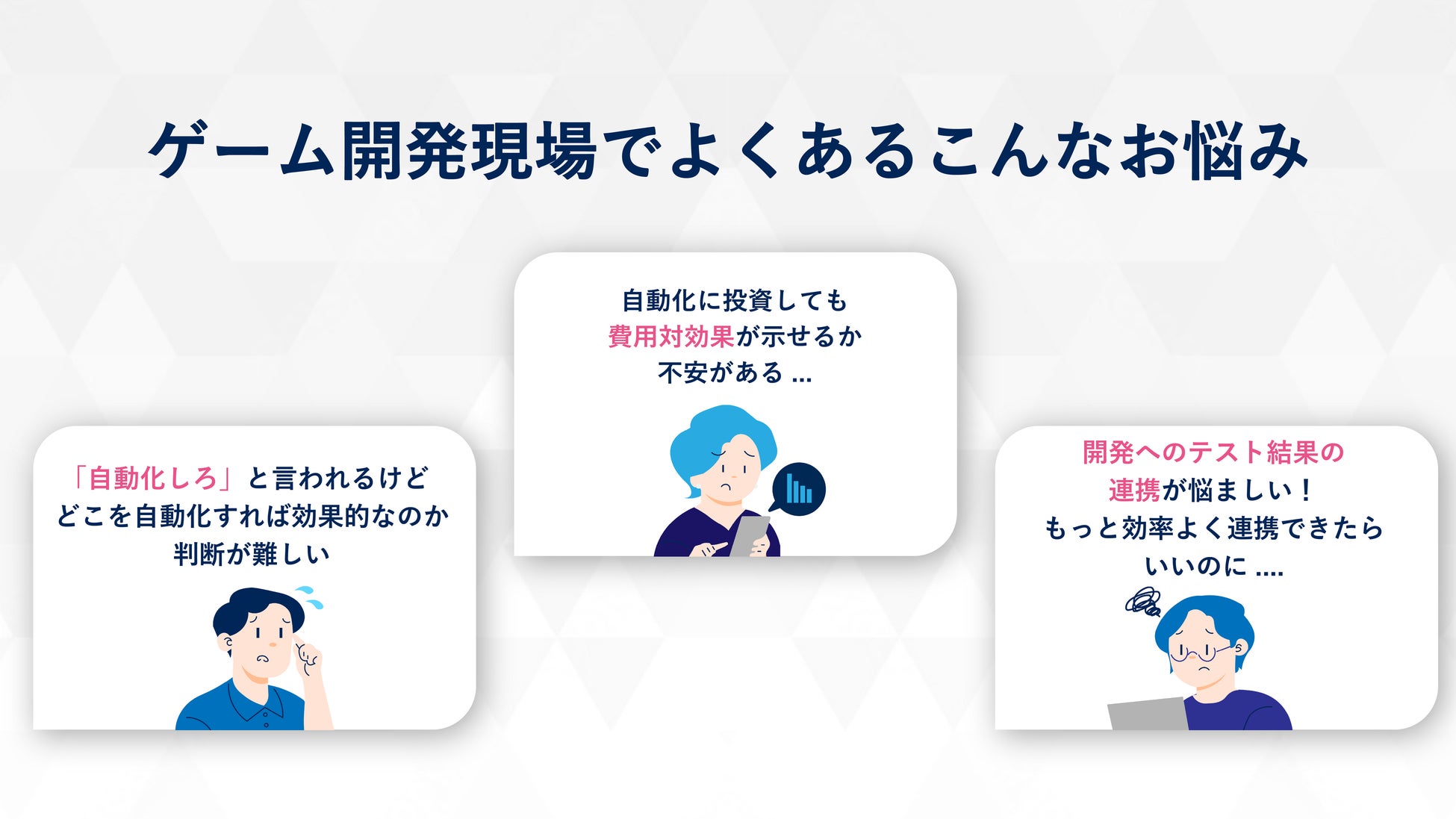 近年のゲーム開発は、グラフィックの高度化・オープンワールド化・マルチプラットフォーム展開などにより、テストが複雑化しています。これに伴い、ゲームテストやデバッグにおいても工数の増大・期間の長期化・テスト品質の属人化などさまざまな課題に直面しています。また、テスト自動化を計画しても複雑なロジックや高い初期・学習コストが障壁となり、導入を断念せざるを得ないケースが多く見られました。