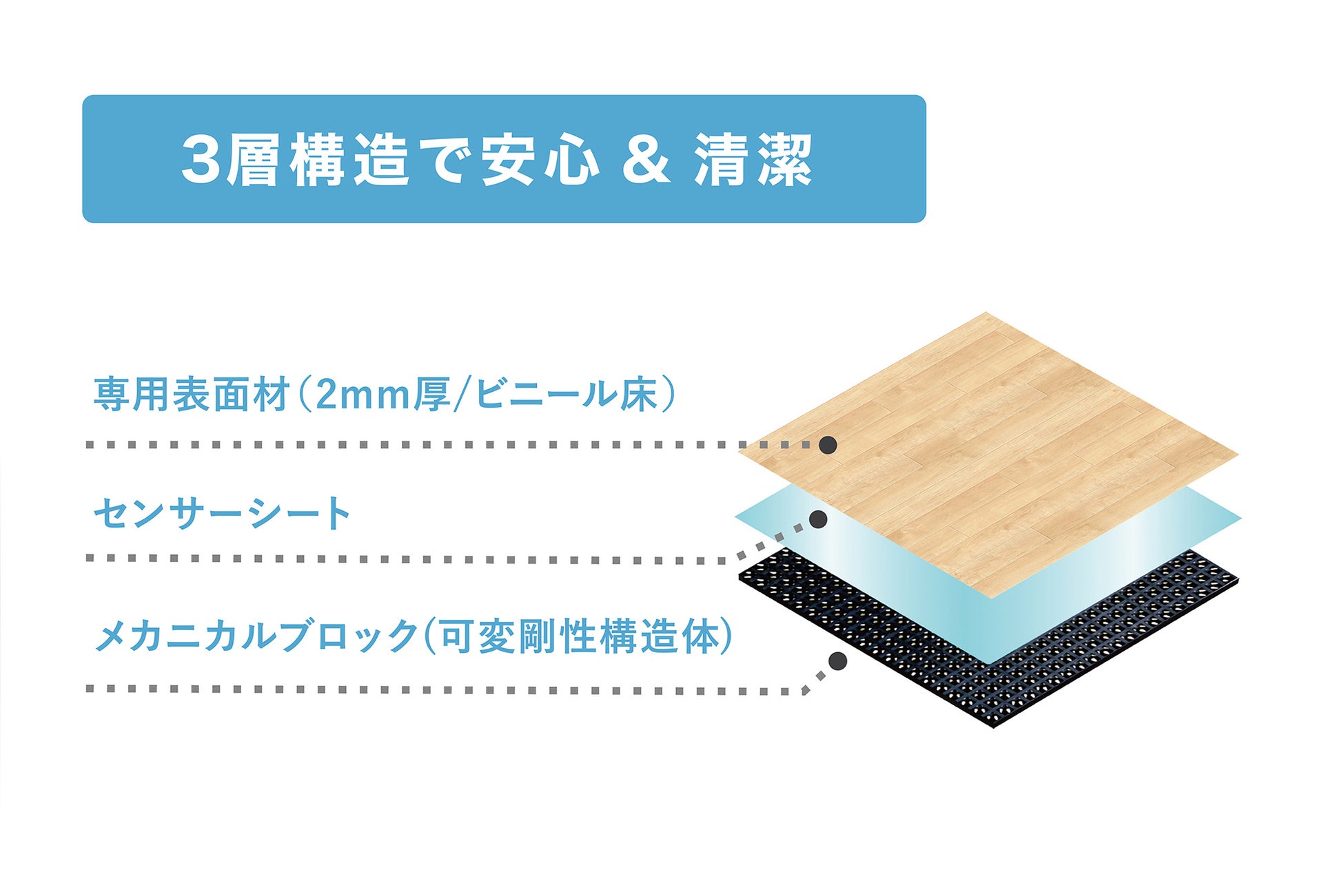 「ころやわ」は、これまで両立が困難とされていた「歩行安定性」と「衝撃吸収性」という2つの性質を併せ持つ、「転んだ時は衝撃を吸収する、普段は硬く安心して歩ける床」です。「ころやわ」内部の可変剛性構造体(メカニカルメタマテリアル)により、一般的なフローリングと同等の歩行安定性を保ちながら、車椅子移動や歩行器、杖をついての移動でも大きく凹まず、その反面転倒時には衝撃を吸収して転倒骨折や外傷リスクを低減する事が可能になりました。(特許出願中)