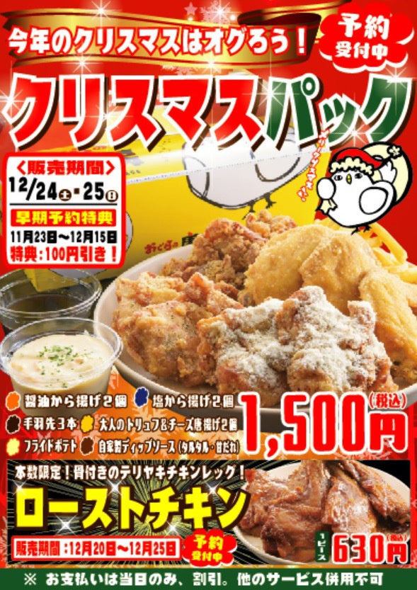 | ▼クリスマスパック 商品概要 商品名 :クリスマスパック 金額 :1,500円(税込) 予約受付 :~12月25日(日) 早期予約特典:12月15日(木)まで 100円引き ※早期予約特典割はおぐらの唐揚での予約受取に限ります お渡し日 :12月24日(土)、25日(日) 販売店舗 :おぐらの唐揚全店舗、さくらや食産阿蘇肉工房 <内容> 醤油から揚げ2個/塩から揚げ2個/手羽先3本/大人のトリュフ&チーズから揚げ2個/フライドポテト/自家製ディップソース(タルタル・甘だれ) おぐらの定番味からクリスマス限定のトリュフ&チーズ味も含めた全6種のから揚げと手羽先、フライドポテト、自家製ディップソースのついた“お得”で豪華なクリスマスパックとなっております!パッケージにはおぐとりしゅん君のかわいいイラスト付き。今年のクリスマスはみんなでおぐりましょう! |