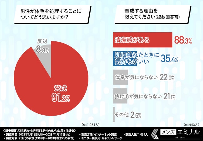 男性が体毛を処理することに関しては9割以上が肯定的で、その理由として、男性に清潔感を強く求めていることがわかりました。