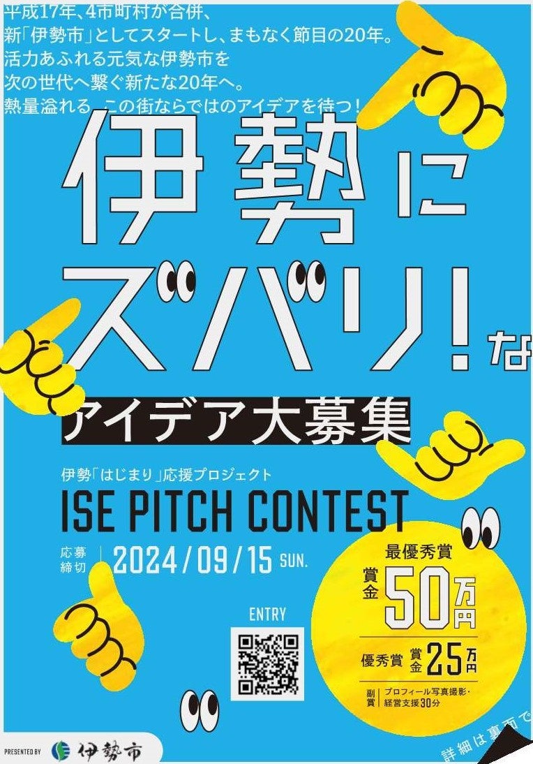 伊勢市が令和7年度に市制20周年を迎えるにあたり、人口減少や少子高齢化が進行するなか、活力あふれる元気な伊勢市を次の世代へ繋ぐため、伊勢の活力創出や地域課題解決の取組開始を促進するため、ISE PITCH CONTESTを開催します。