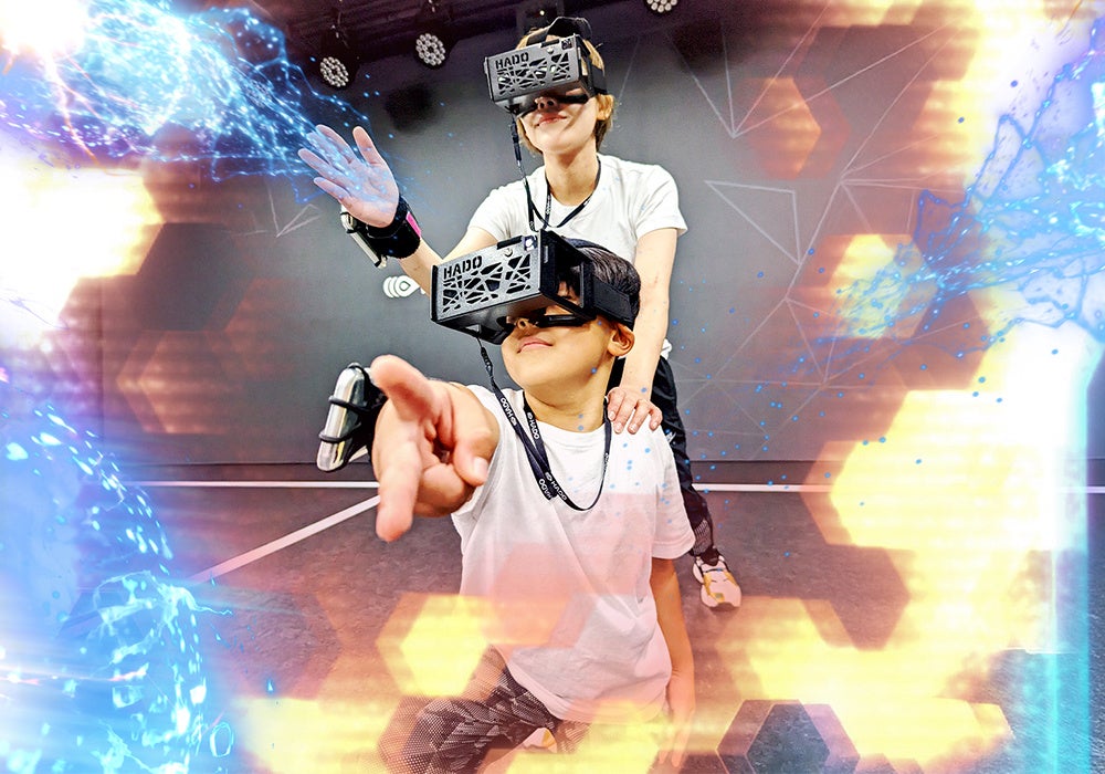 HADOは、AR(拡張現実)技術を活用した次世代型スポーツです。頭にヘッドセット、腕にセンサーを装着し、現実空間で「エナジーボール」を放ち合ったり「シールド」で防御したりしながら対戦します。ケーブルやコントローラーが不要なため、全身を使った直感的なアクションを楽しめるのが特徴です。現在、世界39ヵ国以上で親しまれ、次世代スポーツとして注目を集めています。子どもでもわかりやすいシンプルな操作で誰でも気軽に楽しめます。