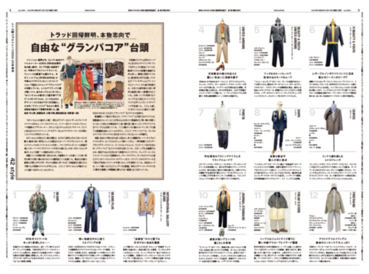 特集最後のページでは、「ジャーナル スタンダード(JOURNAL STANDARD)」のメンズコンセプターと、表紙を担当したスタイリストにインタビュー。具体的なスタイルサンプルや着こなし術を通して、古くて新しい“グランパコア”をより深く理解できる内容になっています。