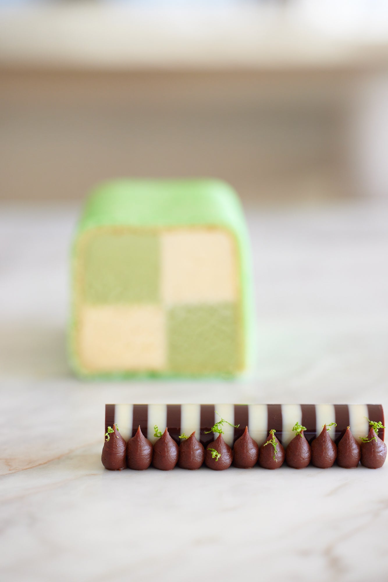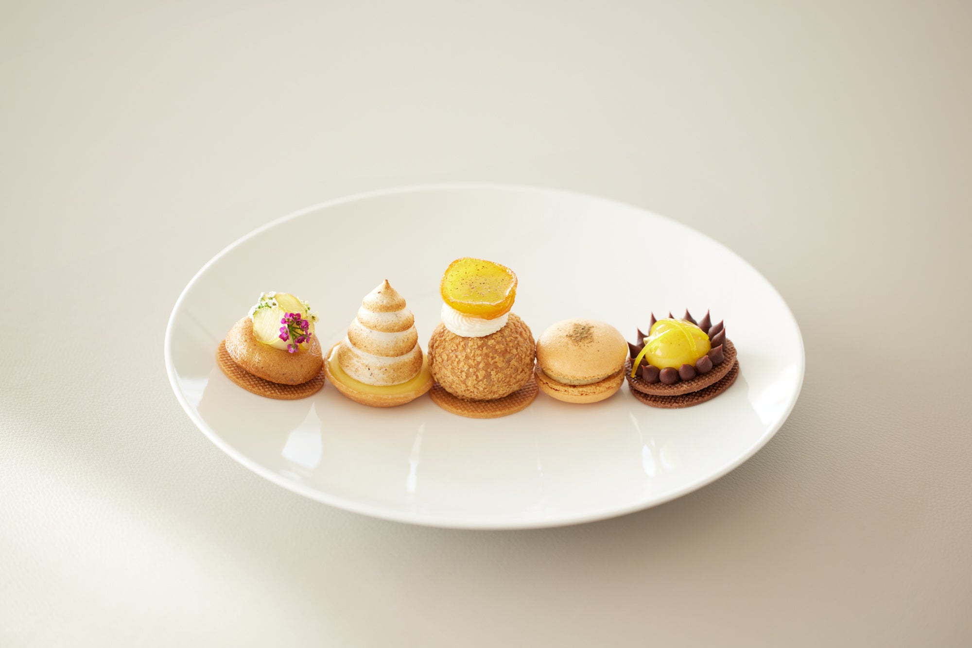フレンチのシュー生地のような軽い生地とキンカンの砂糖漬け、エキストラヴァージンオリーブオイルとチョコレートチップクリームを合わせた「Choux Bombe(シュー ボンブ)」、うっすら香るクリスピーなメレンゲとブラックライムクリームの「Orange Blossom Macaroon(オレンジ ブラッサム マカロン)」、バニラと抹茶のアイスクリームに柑橘類のドミセックをまぶした「Ice Cream Battenberg(アイスクリーム バッテンバーグ)」がお勧めです。