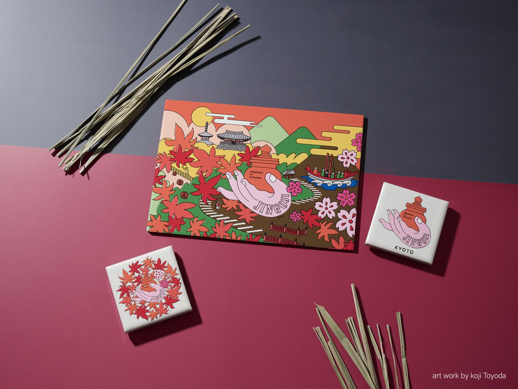 平安初期彫刻の最高傑作である国宝「薬師如来立像」の薬壺を持つ手元を中心に、紅葉や新緑の名所としても知られている、神護寺の自然豊かな環境がカラフルに表現されています。参道の入口にある高雄橋から長い石段を登り、境内最奥の地蔵院から眺めることができる錦雲渓の絶景までの参拝ルートの様子や、厄除けの「かわらけ投げ」を楽しむ人の様子もポップに描かれており、よくよく見ると806年に唐から日本に帰国した空海の姿も見つけられます。神護寺の名所や歴史の魅力をたっぷり詰め込んだ立体ポストカードです。
