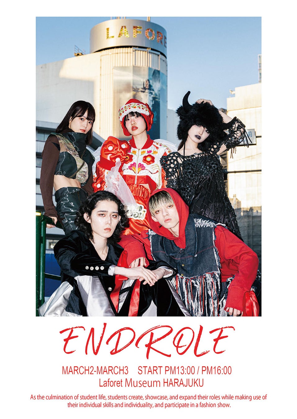 学⽣⽣活の集⼤成(END)として、個のスキルや個性を活かしながらそれぞれの役割(ROLE)を“作る、魅せる、広げる”を全うし、「ENDROLE」というひとつのファッションショーを作り出します。