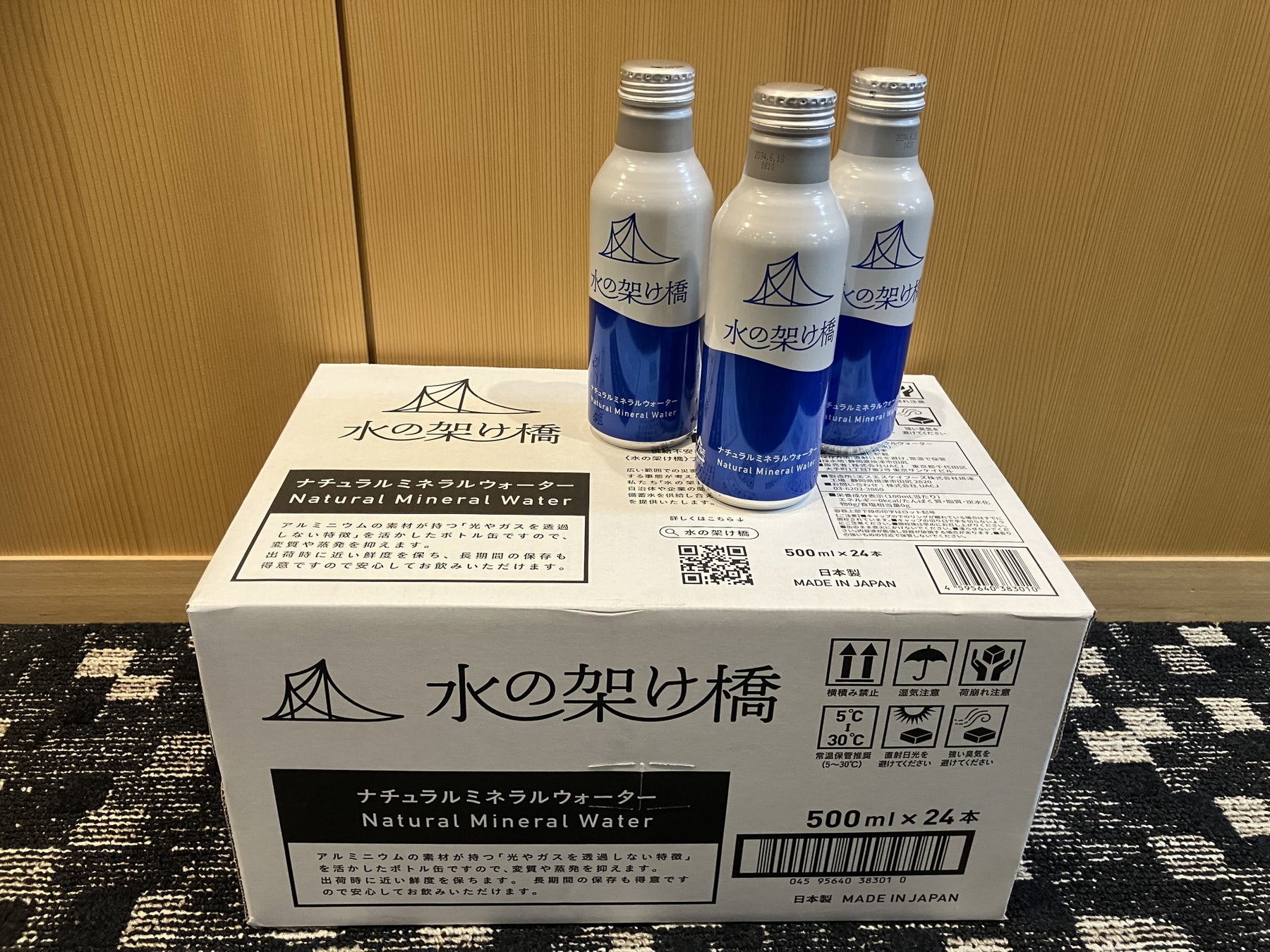 物納品:同社が取り組む『水の架け橋』プロジェクトで取り扱うナチュラルミネラルウォーター(500ml×24本)