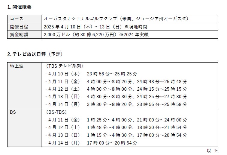 マスターズ・トーナメントは、男子4大メジャーゴルフトーナメントの一つで、毎年4月の第2週に開催される“ゴルフの祭典”です。ケネディクス株式会社(本社:東京都千代⽥区、代表取締役社長COO:寺本光、以下「ケネディクス」)は、昨年に引き続き、2025マスターズ・トーナメントでも番組協賛いたします。