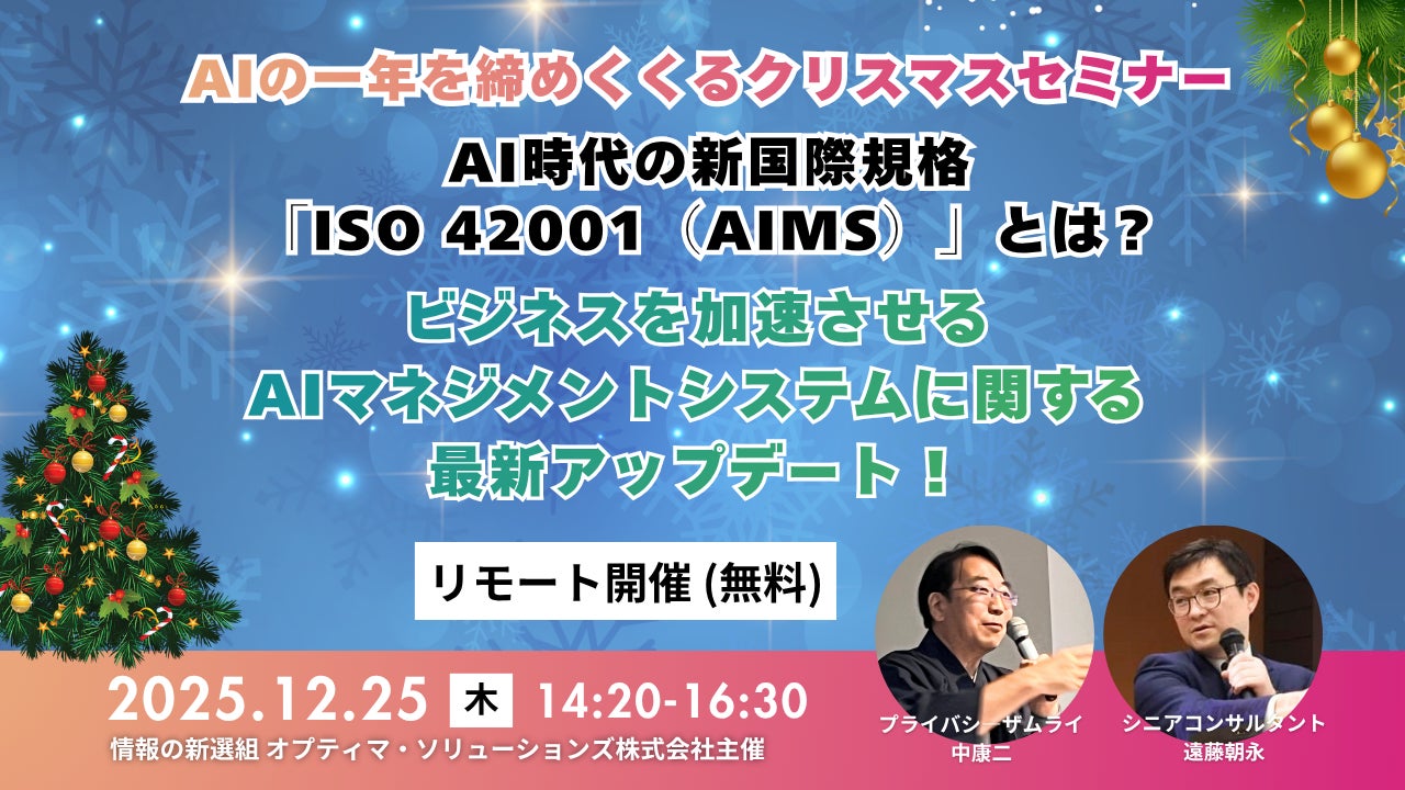 情報セキュリティ専門会社であるオプティマ・ソリューションズ株式会社(本社:東京都港区、代表取締役:中 康二)は、2025年12月25日(木)14時20分より、国際規格ISO 42001(AIマネジメントシステム認証)に関する最新情報をご提供するクリスマスセミナーを開催いたします。(リモート開催・無料)