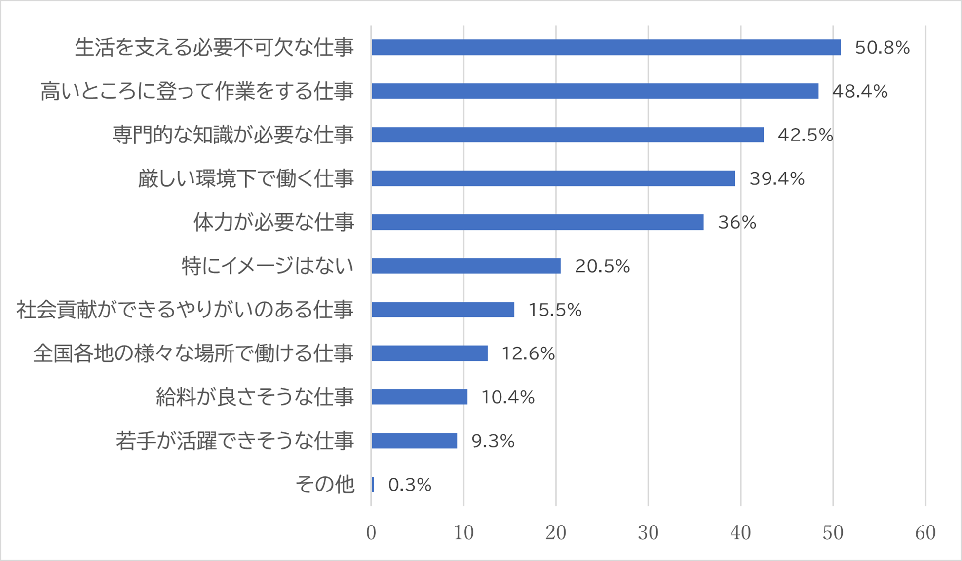ラインマンへのイメージについて聞いたところ、昨年同様、「生活を支える必要不可欠な仕事」と回答した人が約5割(50.8%)と半数を占めた結果となりました。「若手が活躍できそうな仕事」と回答した人は約1割(9.3%)となり、一昨年の11.3%、昨年の8,3%に続き、送電業界の高齢化が進んでいることが読み取れました。