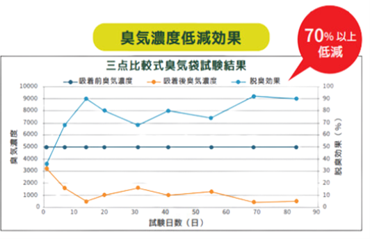 三点比較式臭気袋試験*³を行ったところ、70~90%程度の脱臭効率を有することが明らかになりました。