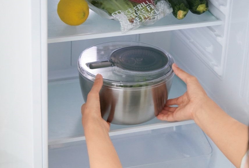 「ステンレス サラダスピナー」はボウル部分がステンレス製なので、水切り後に冷蔵庫で冷やせば、抜群の保冷効果で葉物野菜もシャキシャキに。