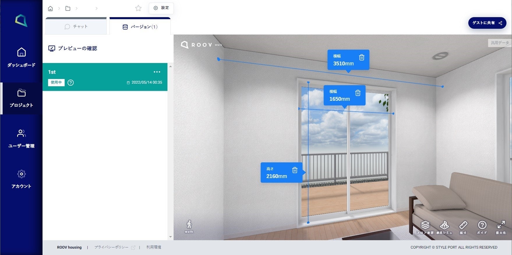 ROOV housingとは株式会社スタイルポートが開発したVRコミュニケーションのためのWebサービスです。新築マンションで培った3Dコミュニケーション技術を注文住宅向けのサービスに応用。施主様が自宅でもバーチャル空間で検討できることで、「理解不足」や「誤認」をなくし、スムーズなコミュニケーションを可能とします。専用アプリは必要なく、URLで簡単にデータを共有することができます。(専用ホームページ https://roov.jp/housing/)