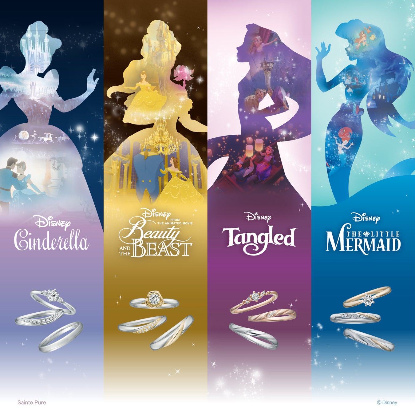 一真堂では、人気の『シンデレラ』『美女と野獣』『Tangled』『リトルマーメイド』『FANTASIA』『STEAMBOAT WILLIE』の世界観を表現したブライダルジュエリーを豊富に取り揃えています。