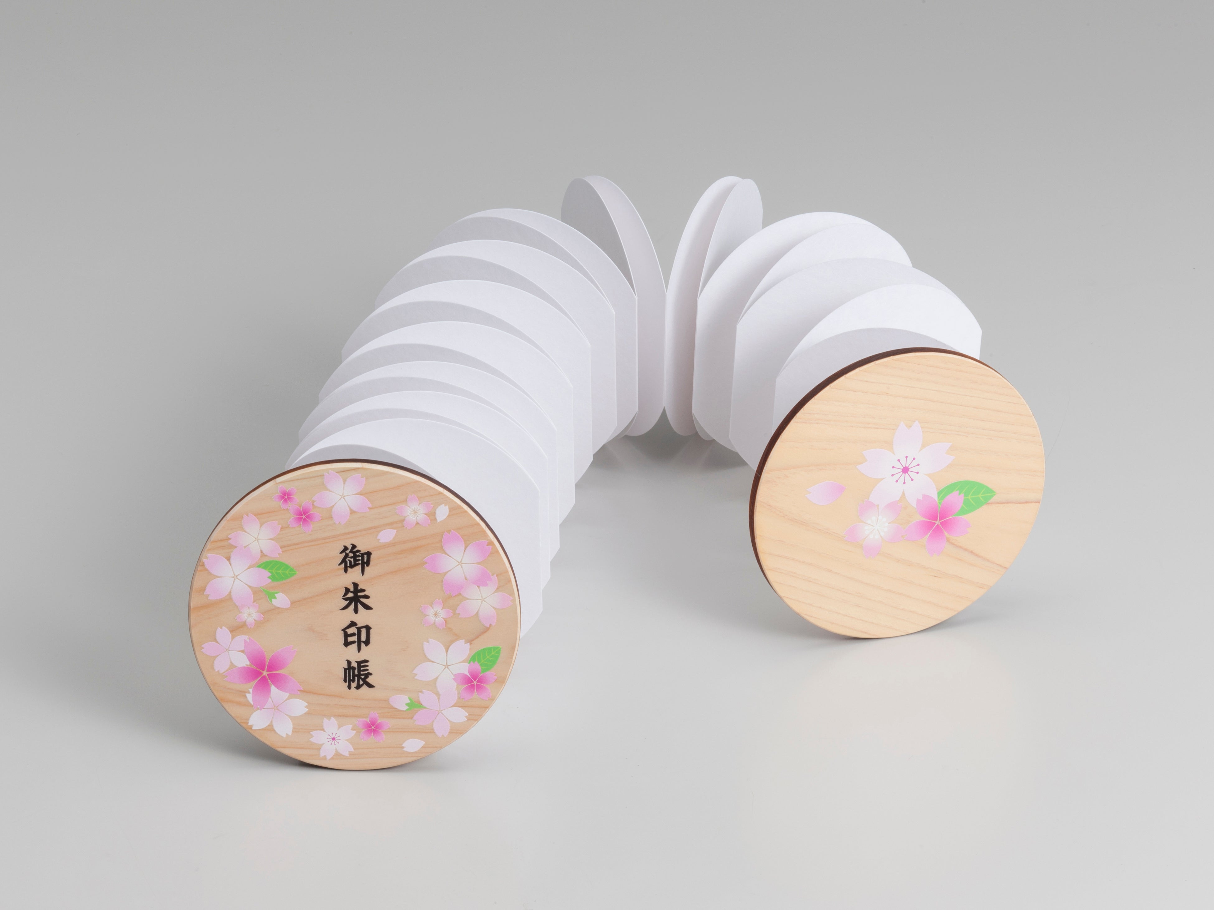 直径130mmの円にカットをしたヒノキ材を表紙に、本文の蛇腹和紙も円形の御朱印帳です。