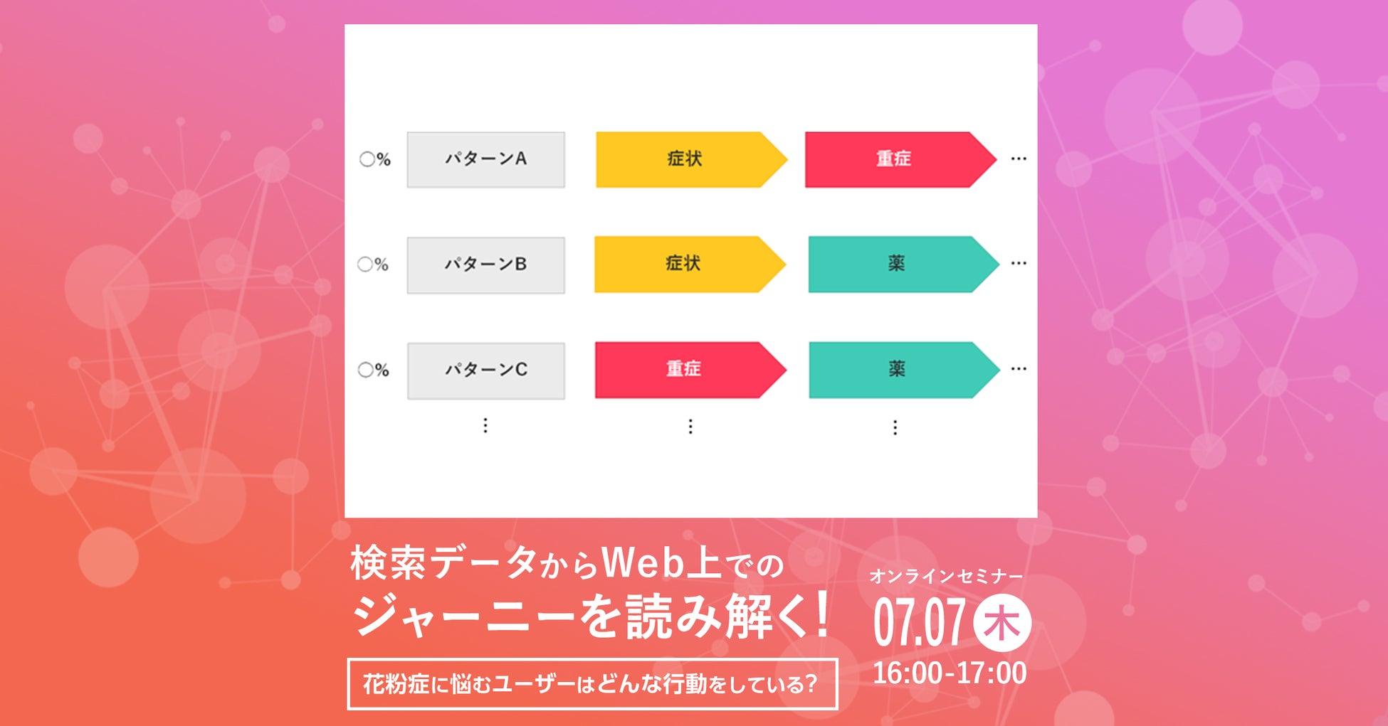 本セミナーでは、「花粉症に悩む方に対して正しい情報を伝え、適切な受診につなげる施策検討」を題材として、花粉症で悩んでいると推測されるユーザーの検索行動などを分析する詳細な方法と、その分析結果から導き出せるアプローチ方法などを解説します。
