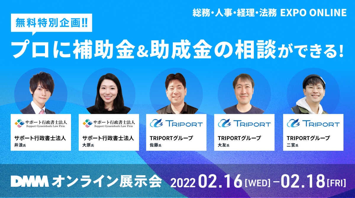 合同会社DMM.com(東京都港区、会長 兼 CEO 亀山敬司 以下、「DMM」)が展開するDMMオンライン展示会では、2022年2月16日(水)から2月18日(金)までの3日間、「総務・人事・経理・法務 EXPO ONLINE」を開催します。この度、オンラインイベント会場で視聴可能なセミナーの登壇者と、本展示会だけの特別企画「補助金・助成金相談会」の詳細が決定しましたので発表いたします。
