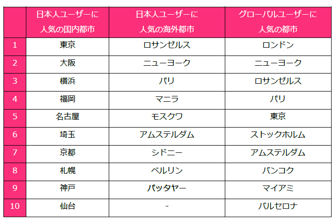 一方で、パスポート機能を利用するグローバルユーザーに人気の都市では、東京が第5位にランクインしており、海外ユーザーにおいて、日本の注目の高さがうかがえる結果となりました。