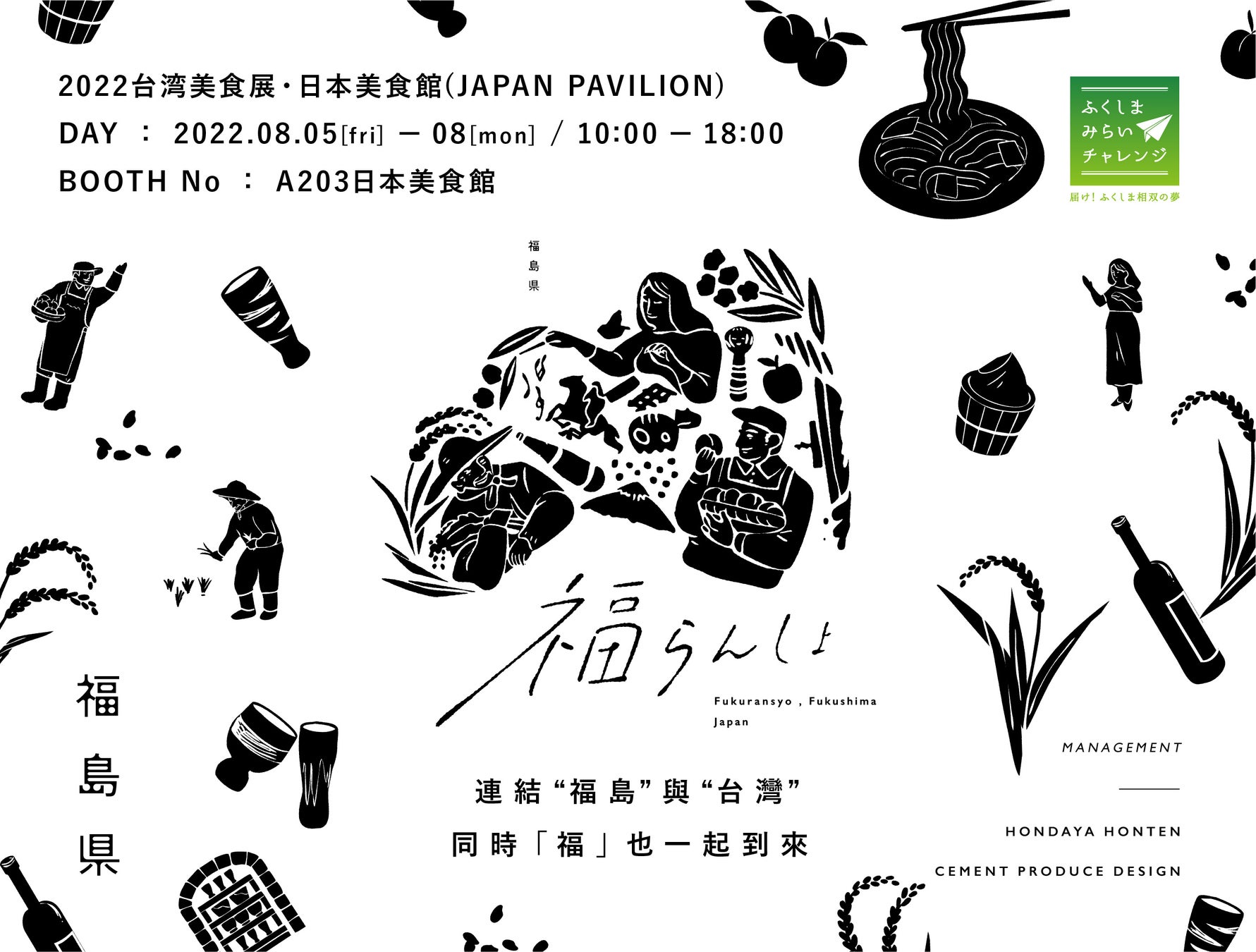 本年度は、11年ぶりに台湾への食品輸入が解禁された福島県産品の食品を通して、更に福島の魅力を台湾へお届けすべく、2022年8月5日~8月8日開催の台湾美食展内、日本美食館に出展いたします。