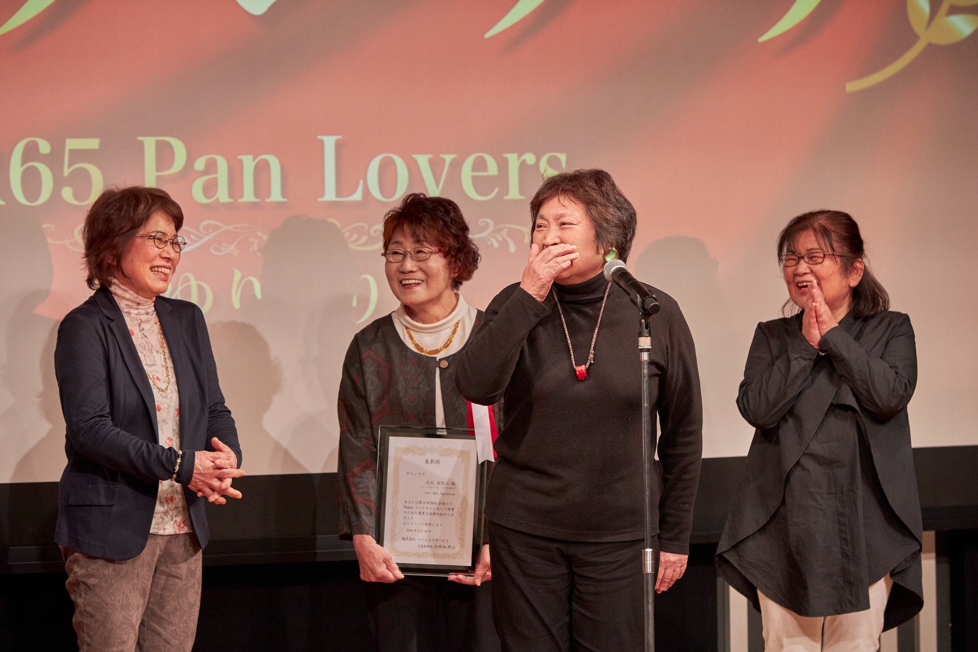 グランプリいただきましてありがとうございます。いつも、高齢者の施設に伺ってボランティア活動しています。今回はテーマがLOVEということで、熱血指導をしてくれる渡辺たく先生がPAN LOVESという曲を作ってくれました。普通に歌えると思ったら、その中にラップが入っていてリズムに乗れない、言葉がちゃんと出てこない、そのうち一生懸命練習しすぎて全部ぶっ飛んじゃうことがいろいろ起きました。その上、インターネット注文していたパンの模型やクッションが期日に届かないということがありましたが、応募にギリギリ間に合いました。このような賞をいただき、ありがとうございます。これからも、精進してボランティア活動を頑張っていきます!