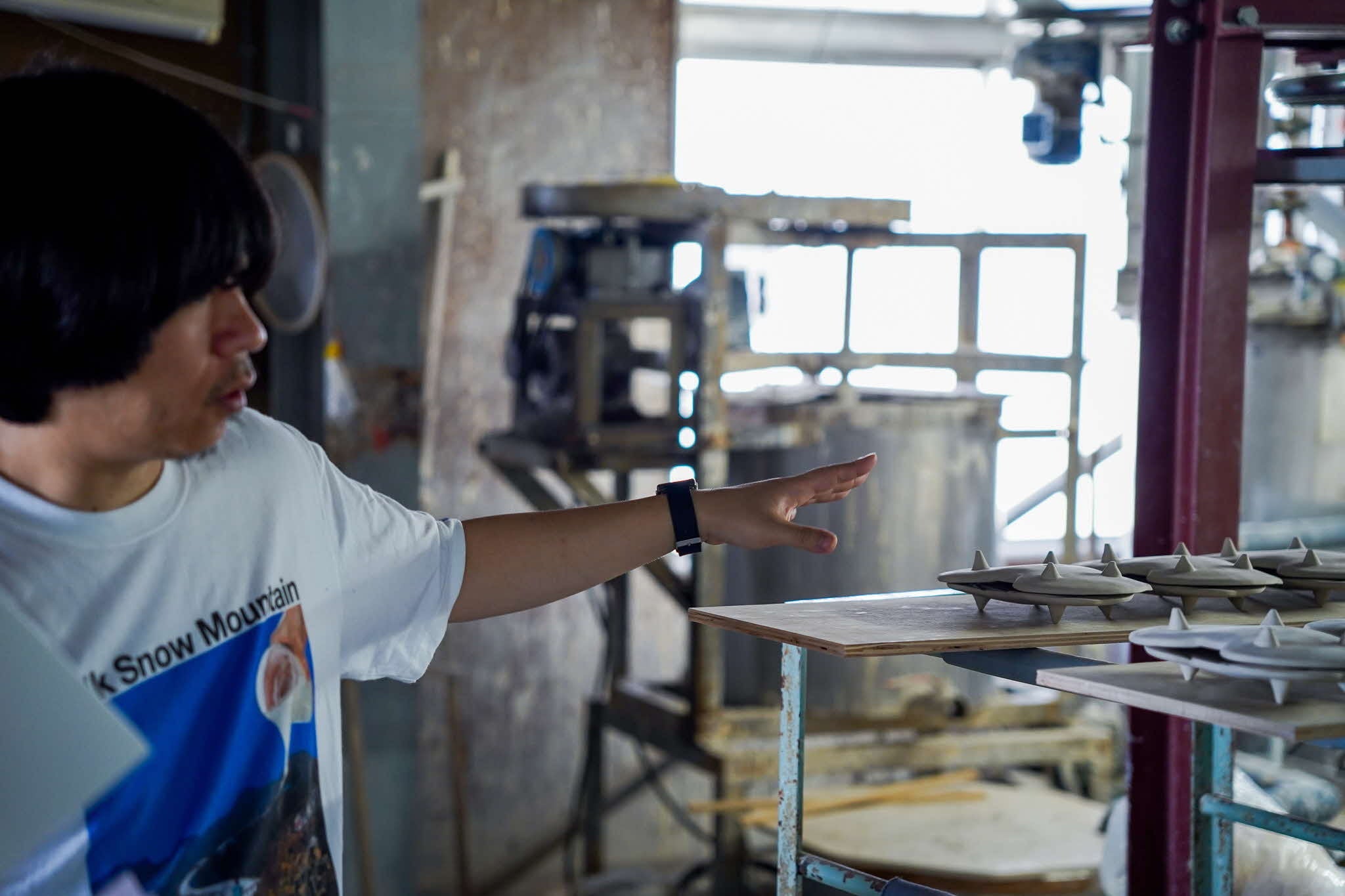 (写真右)上出長右衛門窯では六代目・上出惠悟が工房内を案内。
