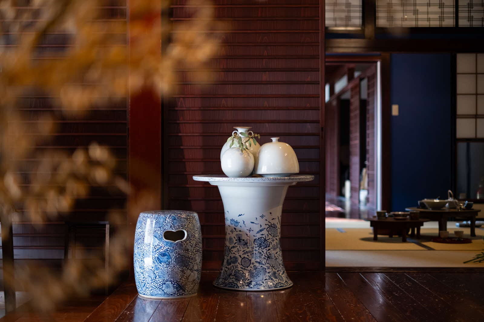 (写真左)赤絵細描のレジェンド「福島武山工房」。工房のうつわでお茶のおもてなしも。