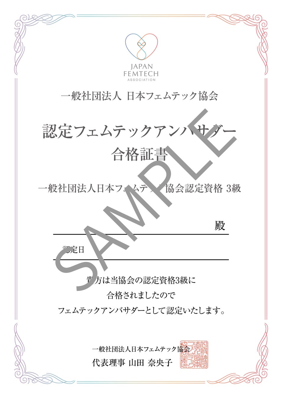3級を無料公開中。当協会では、誰でもいつでも5分で受験できる「フェムテック協会認定資格3級(web受験・無料)」を公開しています。合格するとフェムテックアンバサダーに認定され、認定証書をダウンロードできます。まずはこちらの試験で基礎知識を確認するのがオススメです。