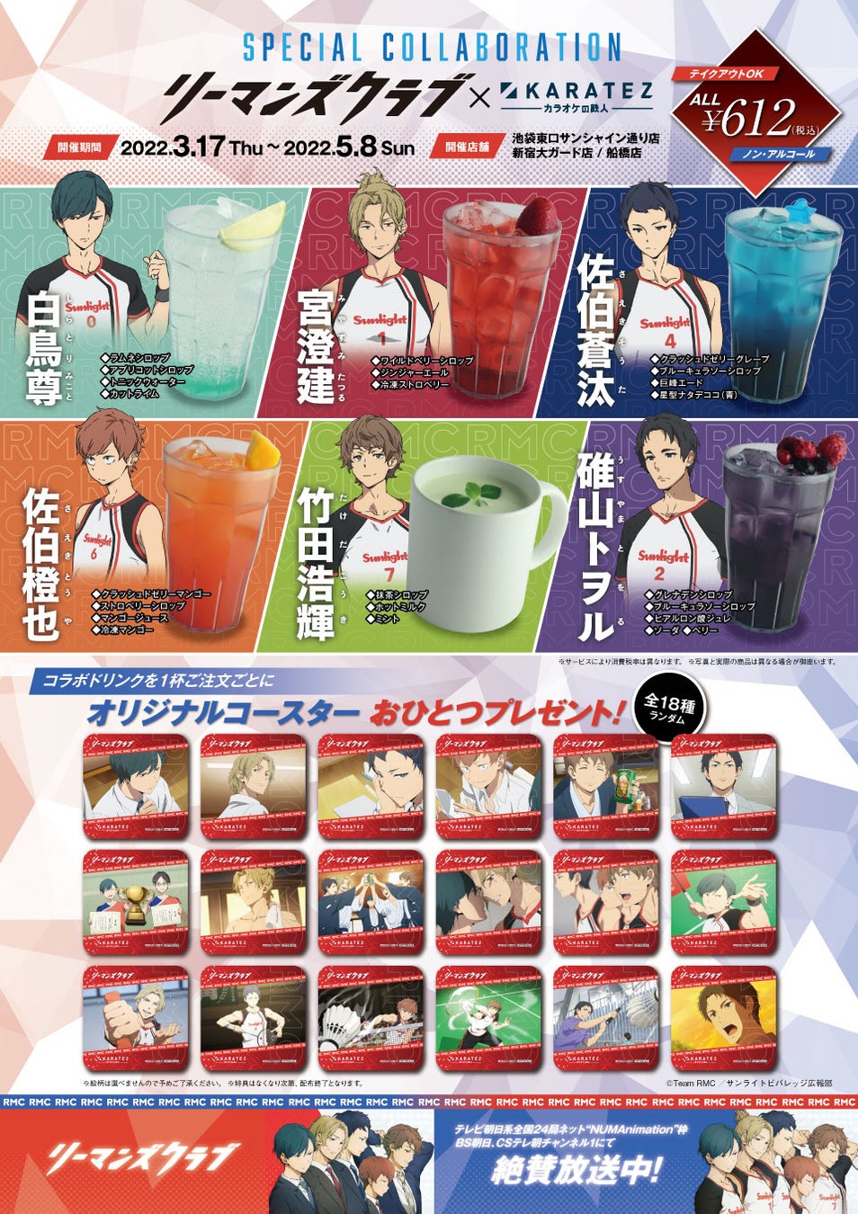 アニメに登場する企業「サンライトビバレッジ」にサラリーマンとして勤務し、実業団選手でもある「白鳥 尊」「宮澄 建」「佐伯蒼汰」「佐伯橙也」「竹田浩輝」「碓山トヲル」をイメージしたオリジナルコラボドリンクを、各612円(税込)[テイクアウトの場合は600円(税込)]で販売します。ノベルティとして、コラボドリンク1杯の購入につき1枚のコースターを、全18種の中からランダムでプレゼントします。
