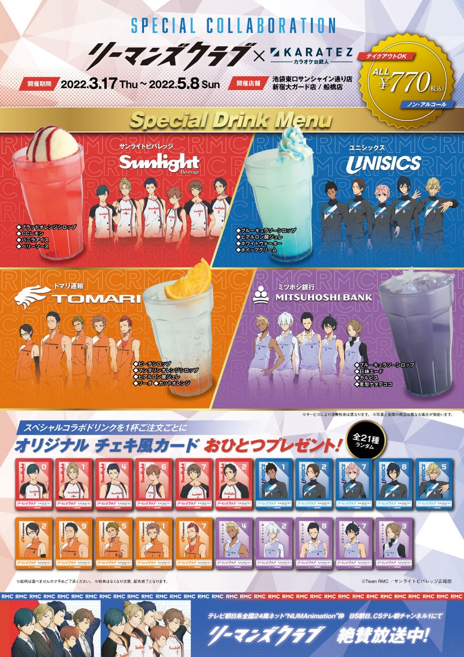 作品に登場する実業団「サンライトビバレッジ」「ユニシックス」「トマリ運輸」「ミツホシ銀行」の企業カラーをイメージした、スペシャルコラボドリンク770円(税込) [テイクアウトの場合は756円(税込)]で販売します。ノベルティとしてスペシャルコラボドリンク1杯の購入につき1枚のチェキ風カードを、全21種の中からランダムでプレゼントします。