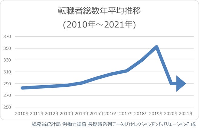 2019年までの転職者数が増加していたことは、総務省統計局の労働力調査から判明しています。しかし同調査によれば、2020年、2021年の転職者数は一転して減少し、2022年1月~3月期の転職者数速報値でも合計262万人と、1994年の253万人以来の最低値を更新しました。