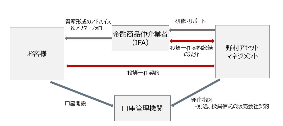 当社は、当サービスにおいて、自ら設定・運用する5本の投資信託を用いて、お客様のリスク許容度に応じた運用を行います。投資期間中は、金融商品仲介業者がアドバイザーとしてお客様に伴走し、ゴール達成に向けて資産形成等に向けた助言を行います。また、当社は、投資信託の販売員向けに実施している研修プログラムなどと同様の充実したサポートを、アドバイザーに対しても提供します。
