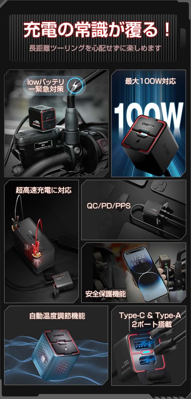 世界初!バイク専用PD急速100W充電!バイクバッテリー充電ースマホやPC充電双方向充電対応