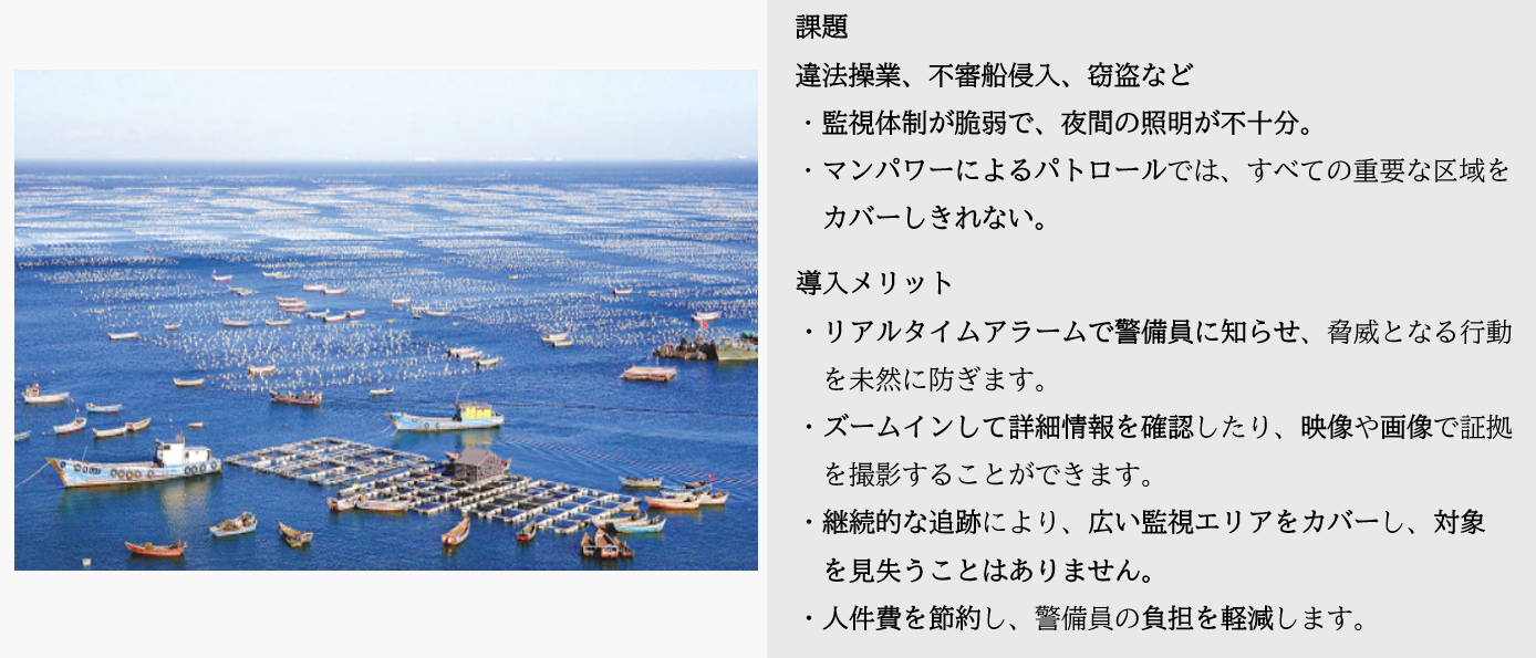 船舶がトリガーとなった場合、スピードドームは素早くズームインして詳細を明確に映し出し、対象を見失うことなく自動的に追跡して継続的に監視することが可能です。