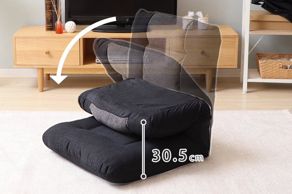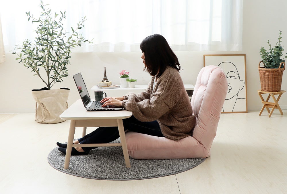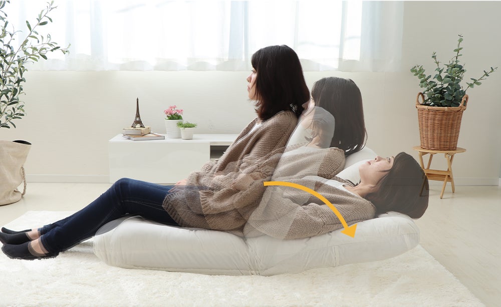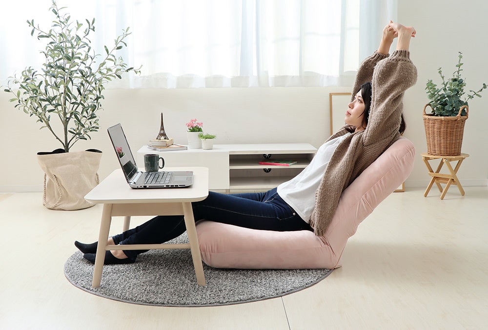 見た目はおしゃれな座椅子ですが、背もたれにギミックがあり、ぐぃーっと体を反らしてストレッチができます。普段使いの座椅子にストレッチ機能がついているので、日々のすき間時間にストレッチできる手軽さが人気の秘密です!