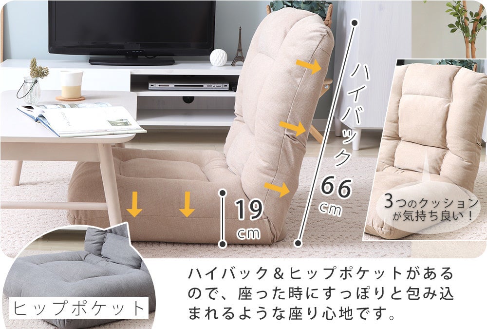 ストレッチができる機能だけではなく、座椅子としての座り心地にも定評があります!シートには36個のポケットコイルを使用しており、まるでソファのようなしっかりした座り心地。そして背もたれは、ゆったり座れるハイバック仕様、背もたれのふわふわクッション、おしりがすっぽり収まるヒップポケットなど、これでもか!というほど座り心地を追求した機能が盛り込まれています。
