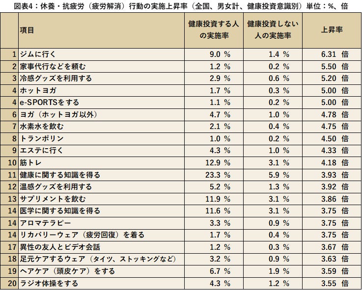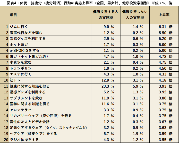 休養・抗疲労行動の実施率を健康に対する投資意識の有無で比較すると、上昇率が高いのは1位「ジムに行く」6.31倍、2位「家事代行などを頼む」5.50%、3位「冷感グッズを利用する」5.20倍、4位「ホットヨガ」「e-SPORTSをする」5.00倍という結果となりました。健康への投資意識が高い人は、家事代行、水素水、サプリメント、リカバリーウェアなど、新しい情報やアイテムを積極的に取り入れた休養・抗疲労行動をしていることが分かります。