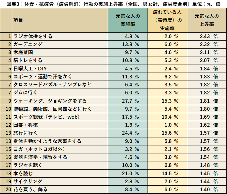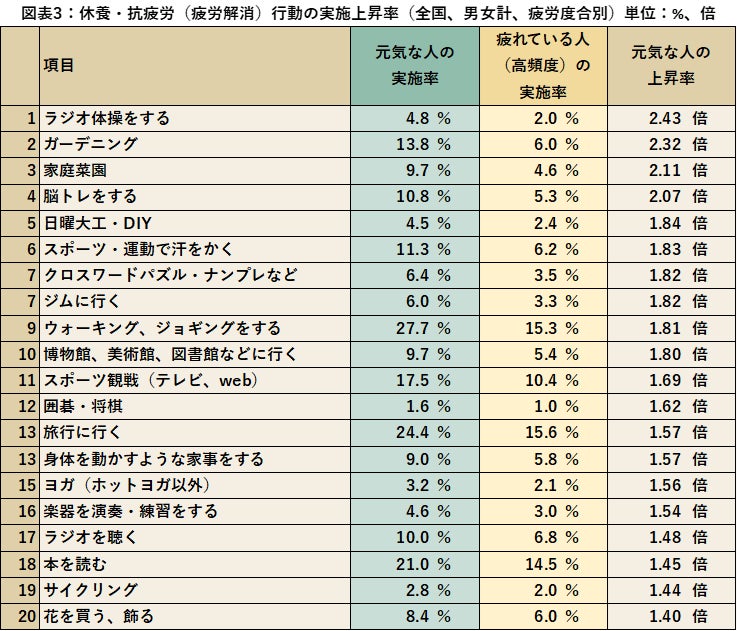 疲労度合別では、元気な人は「ラジオ体操」が2.43倍
