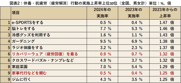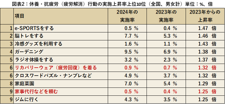 2023年と比較した休養・抗疲労行動の実施上昇率TOP10をみると、1位「e-SPORTSをする」、2位「脳トレをする」、3位「冷感グッズを利用する」、4位「ガーデニング」、5位「ラジオ体操をする」という結果になりました。新しい項目として上昇した「リカバリーウェア(疲労回復)を着る」「家事代行などを頼む」にも注目です。手軽にできる行動に加え、新しいソリューションを積極的に取り入れる人が増加しています。